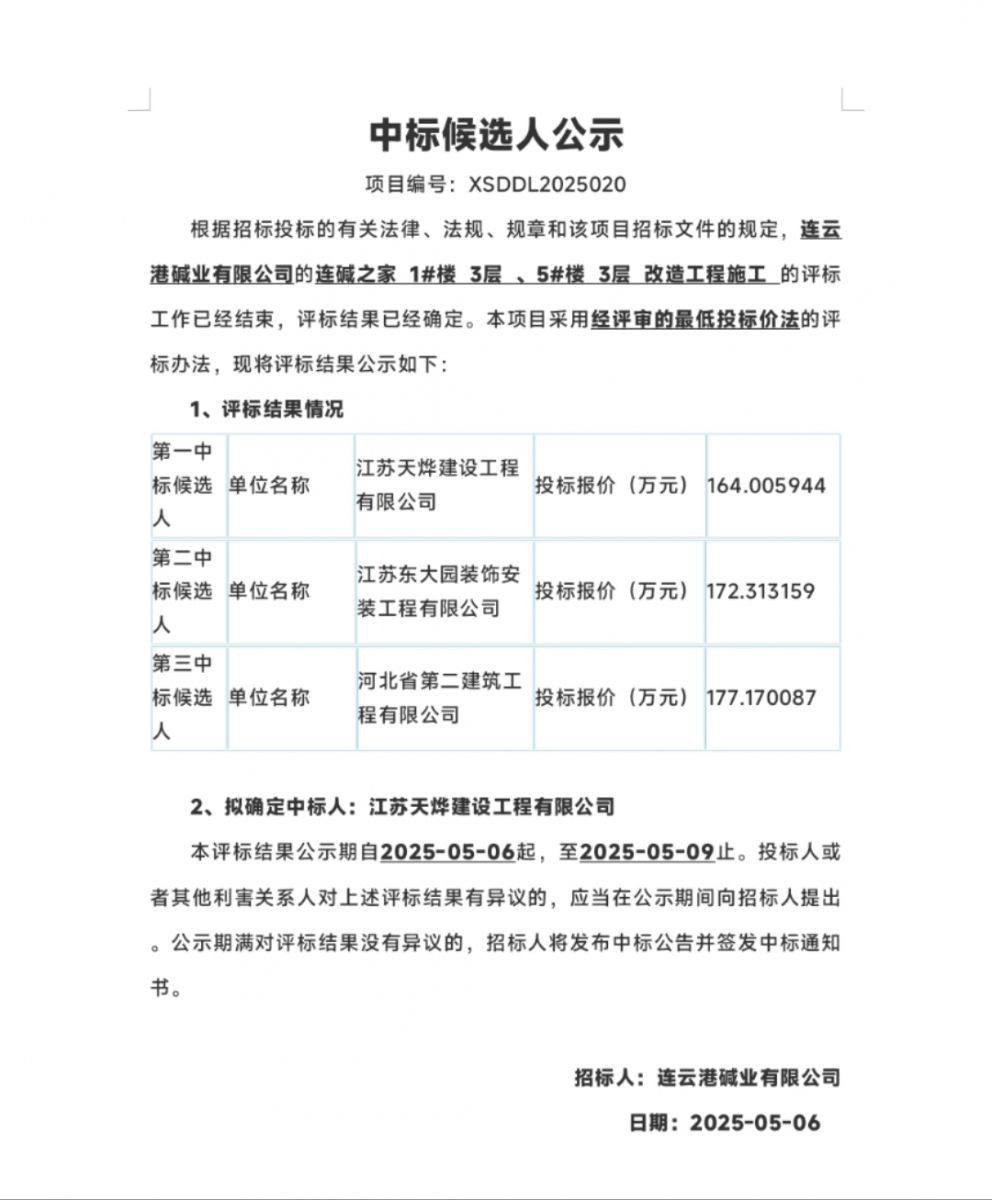 連云港堿業(yè)有限公司的連堿之家1#樓 3層 、5#樓 3層 改造工程施工中標(biāo)候選人公示