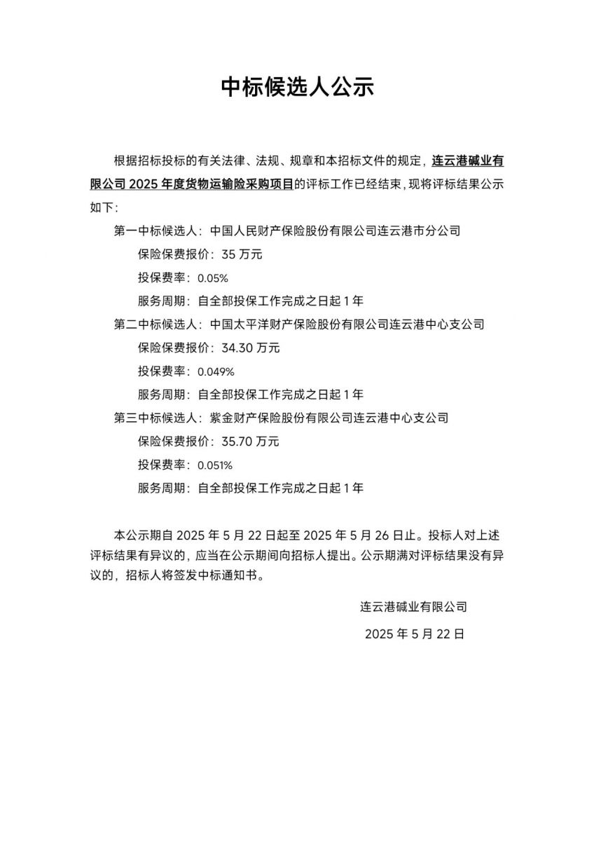 連云港堿業(yè)有限公司2025年度貨物運輸險采購項目中標候選人公示