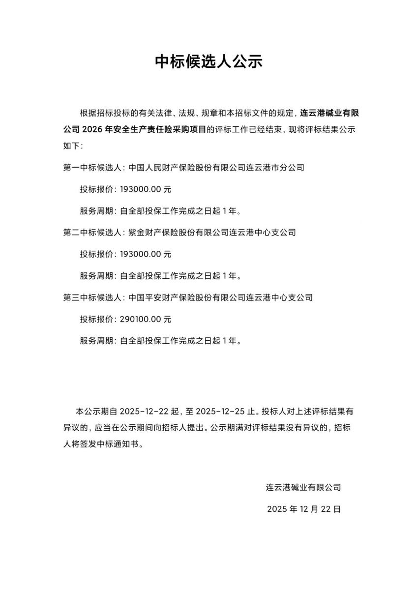 連云港堿業(yè)有限公司2026年安全生產(chǎn)責任險采購項目中標候選人公示