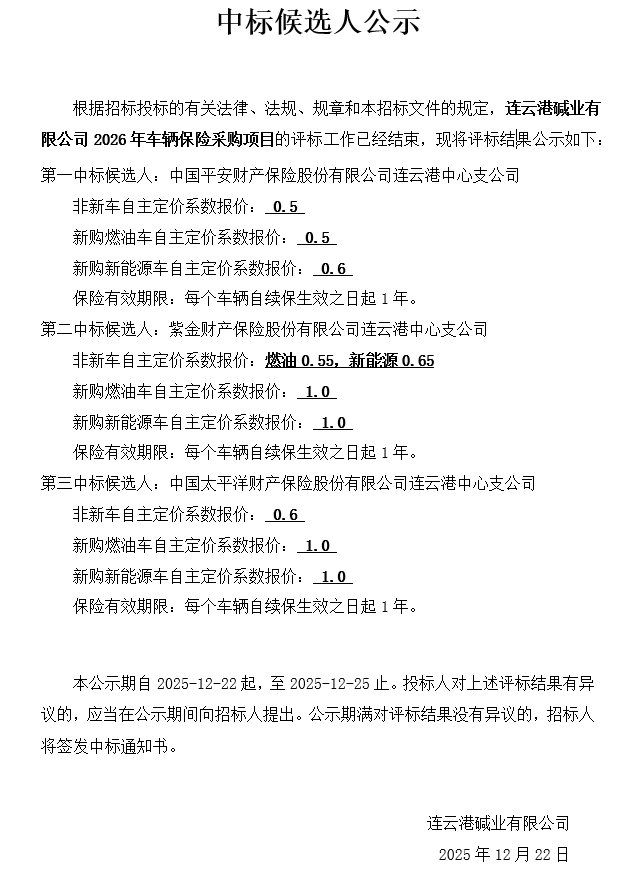 連云港堿業(yè)有限公司2026年車輛保險(xiǎn)采購項(xiàng)目中標(biāo)候選人公示