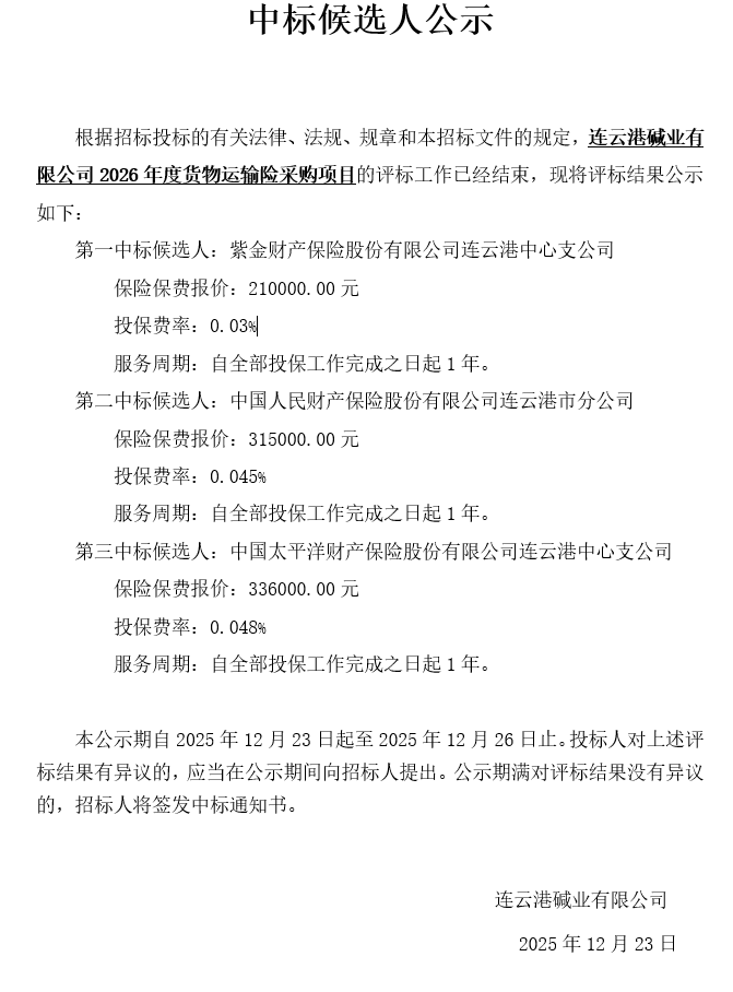 連云港堿業(yè)有限公司2026年度貨物運輸險采購項目中標候選人公示