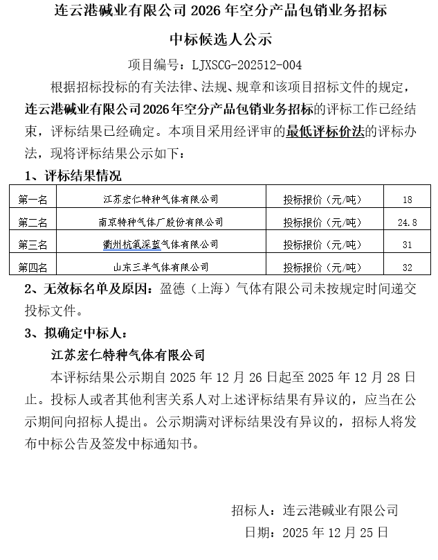 連云港堿業(yè)有限公司2026年空分產(chǎn)品包銷業(yè)務(wù)招標(biāo)中標(biāo)候選人公示