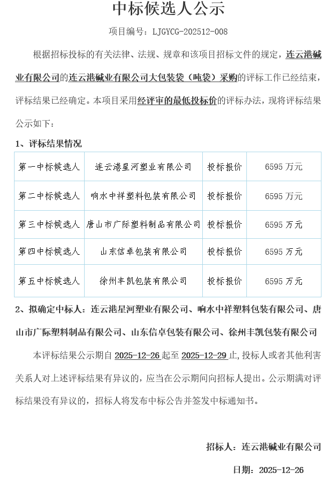 連云港堿業(yè)有限公司的連云港堿業(yè)有限公司大包裝袋(噸袋)采購(gòu)中標(biāo)候選人公示