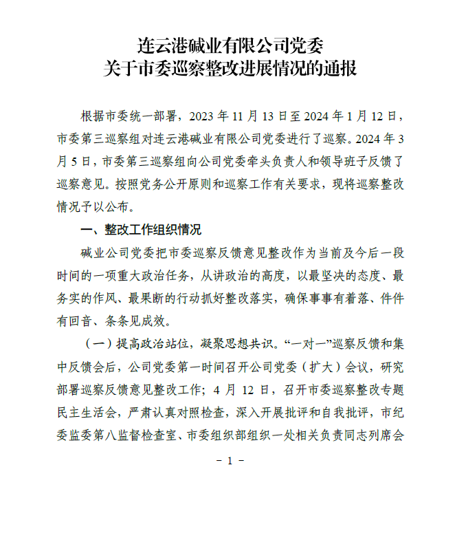 連云港堿業(yè)有限公司黨委關(guān)于市委巡察整改進(jìn)展情況的通報(bào)