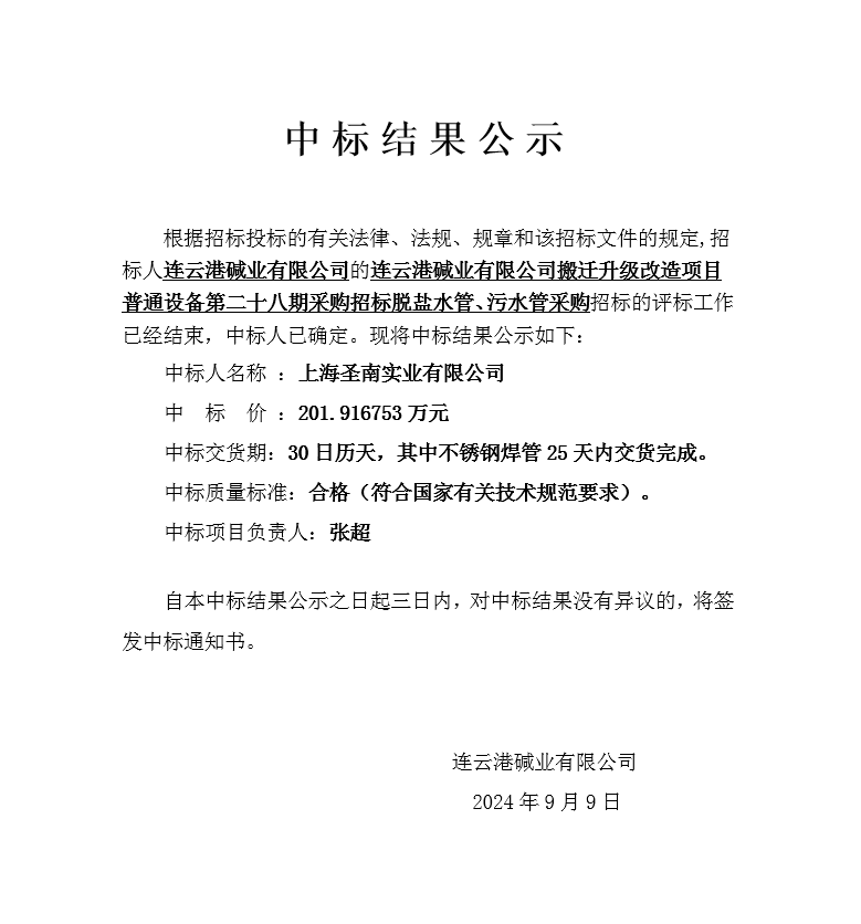 搬遷升級改造項目普通設備第二十八期采購招標脫鹽水管、污水管采購中標結(jié)果公示