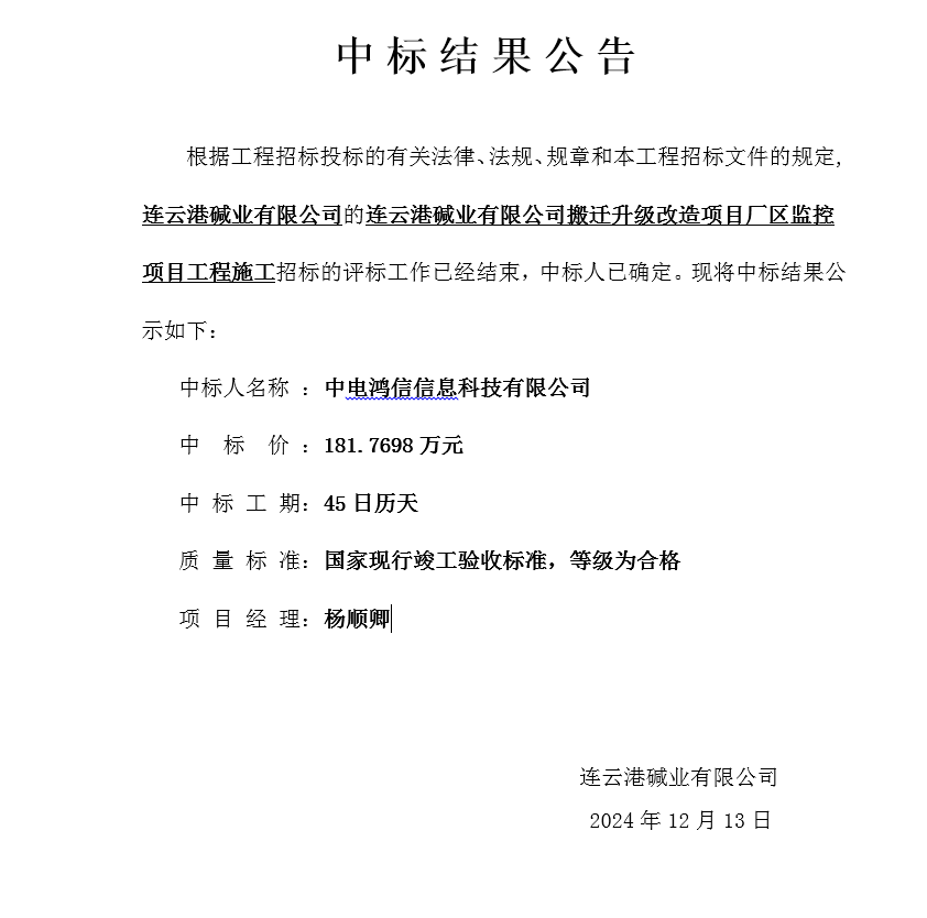 連云港堿業(yè)有限公司搬遷升級改造項目廠區(qū)監(jiān)控項目工程施工中標結(jié)果公告